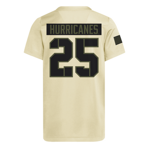 A tribute piece for young Canes fans, this military-inspired jersey brings a bold look to game days. Lightweight, breathable, and built for comfort, it’s the perfect way for kids to rep Miami while honoring those who serve.