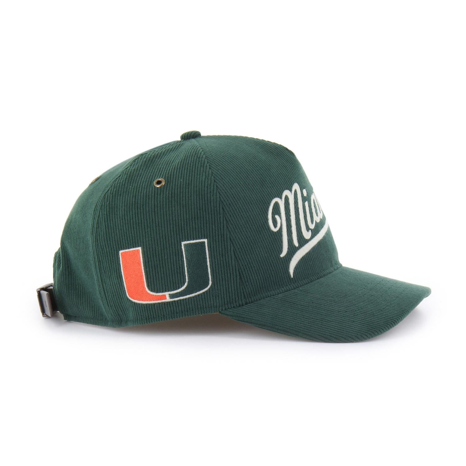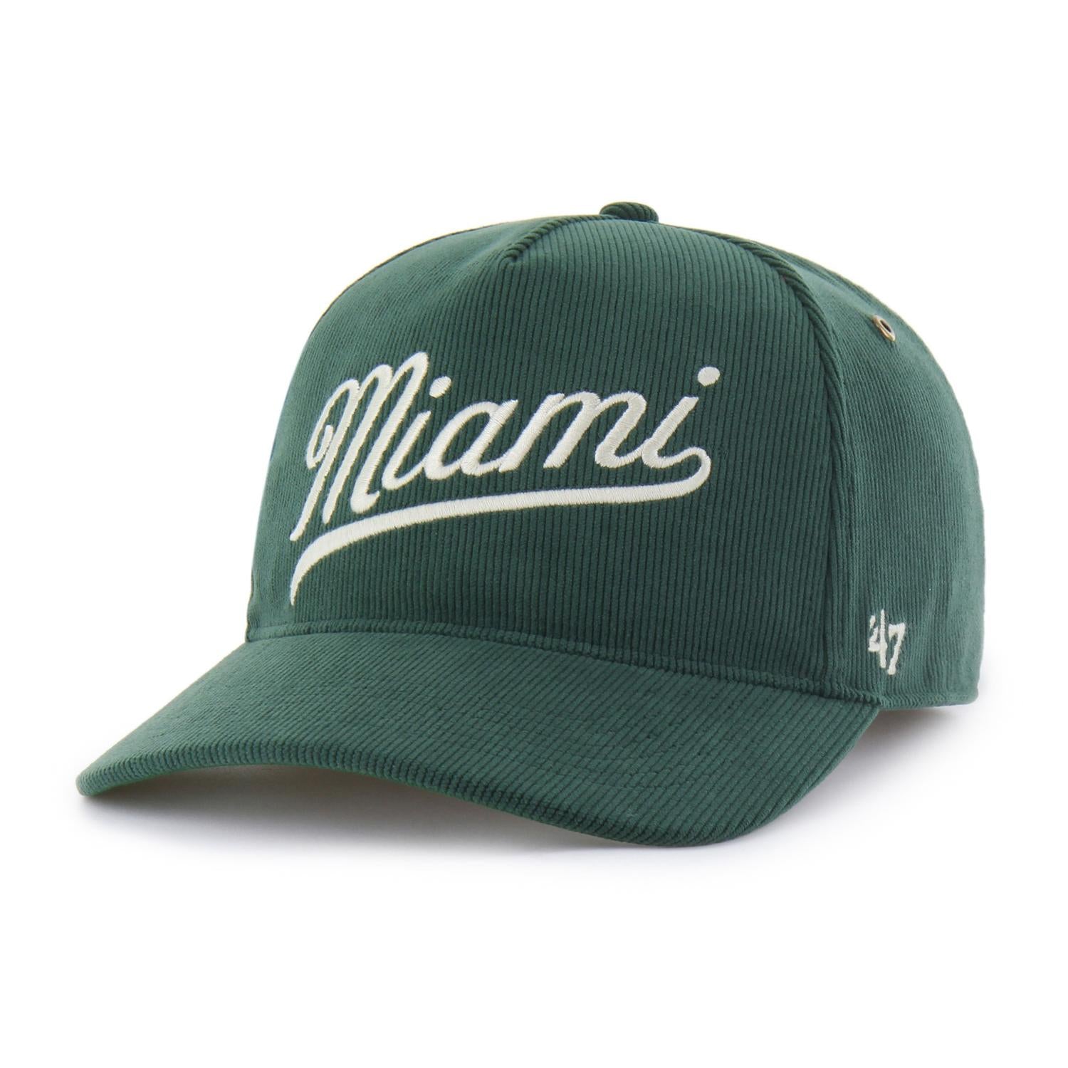This green corduroy cap features a retro “Miami” script across the front and the signature split “U” logo on the side for authentic Miami flair. With its textured fabric and vintage style, it's a standout piece for fans who love timeless college vibes.