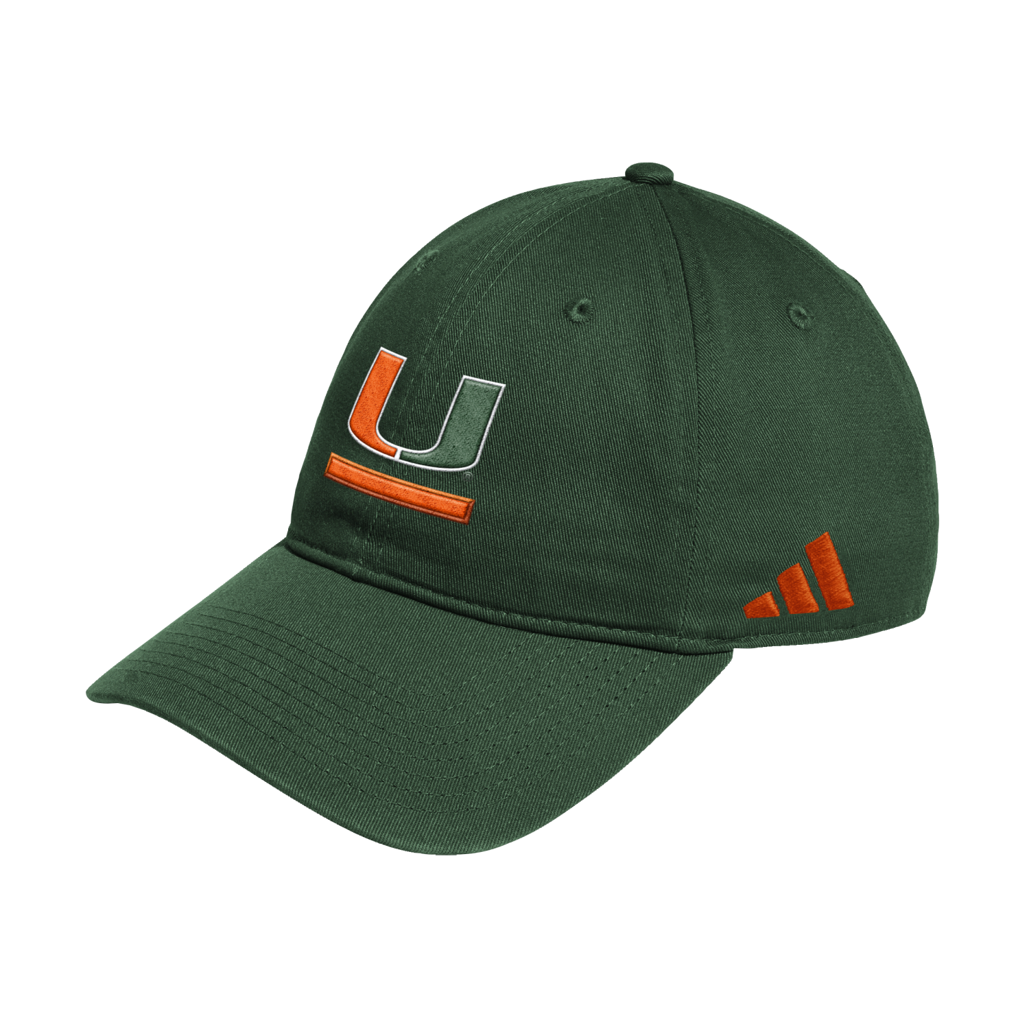 Represent Miami in style with this dark green adidas hat featuring the classic split "U" logo in orange and green. With its sleek design and embroidered adidas branding, it’s a must-have for any Miami fan.