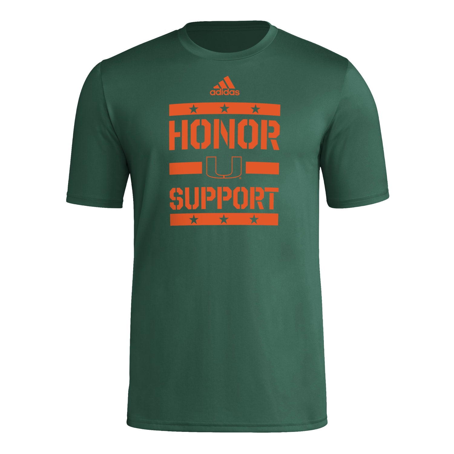 Show your support for both Miami and the military with the adidas Miami Hurricanes 2024 AREOREADY Military Appreciation Pregame Green T-Shirt. Designed for comfort and performance, this lightweight tee features moisture-wicking AEROREADY technology and a striking graphic that honors our troops.