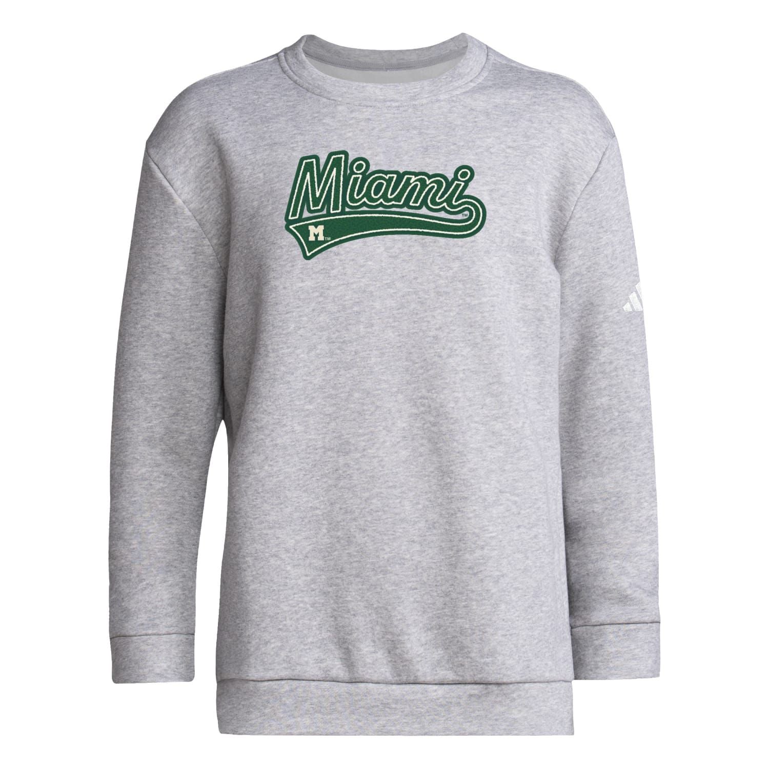 This youth grey crewneck sweatshirt features "Miami" in bold green lettering across the chest, giving it a sporty, collegiate look. Designed for comfort and style, it includes the adidas logo on the sleeve, making it perfect for everyday wear or showing your Miami spirit.